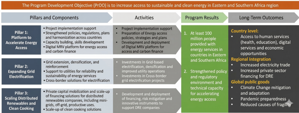 The Program Development Objective, to which participating countries and regional institutions will contribute, is to increase access to sustainable and clean energy in Eastern and Southern Africa. This includes access to on-grid and off-grid (DRE) electricity solutions as well as clean cooking.