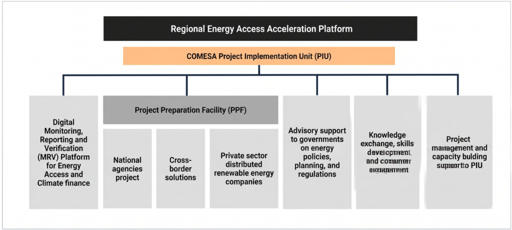 COMESA will implement the US$50 million Regional Energy Access Acceleration Platform, which will support all ASCENT MPA participant countries, including both COMESA and non-COMESA members. It will provide support to countries that have joined the ASCENT program, as well as those that are preparing their projects for program entry. Support will be provided to governments, national utilities, agencies, and private-sector service providers, with particular emphasis on distributed renewable energy and clean cooking sectors.